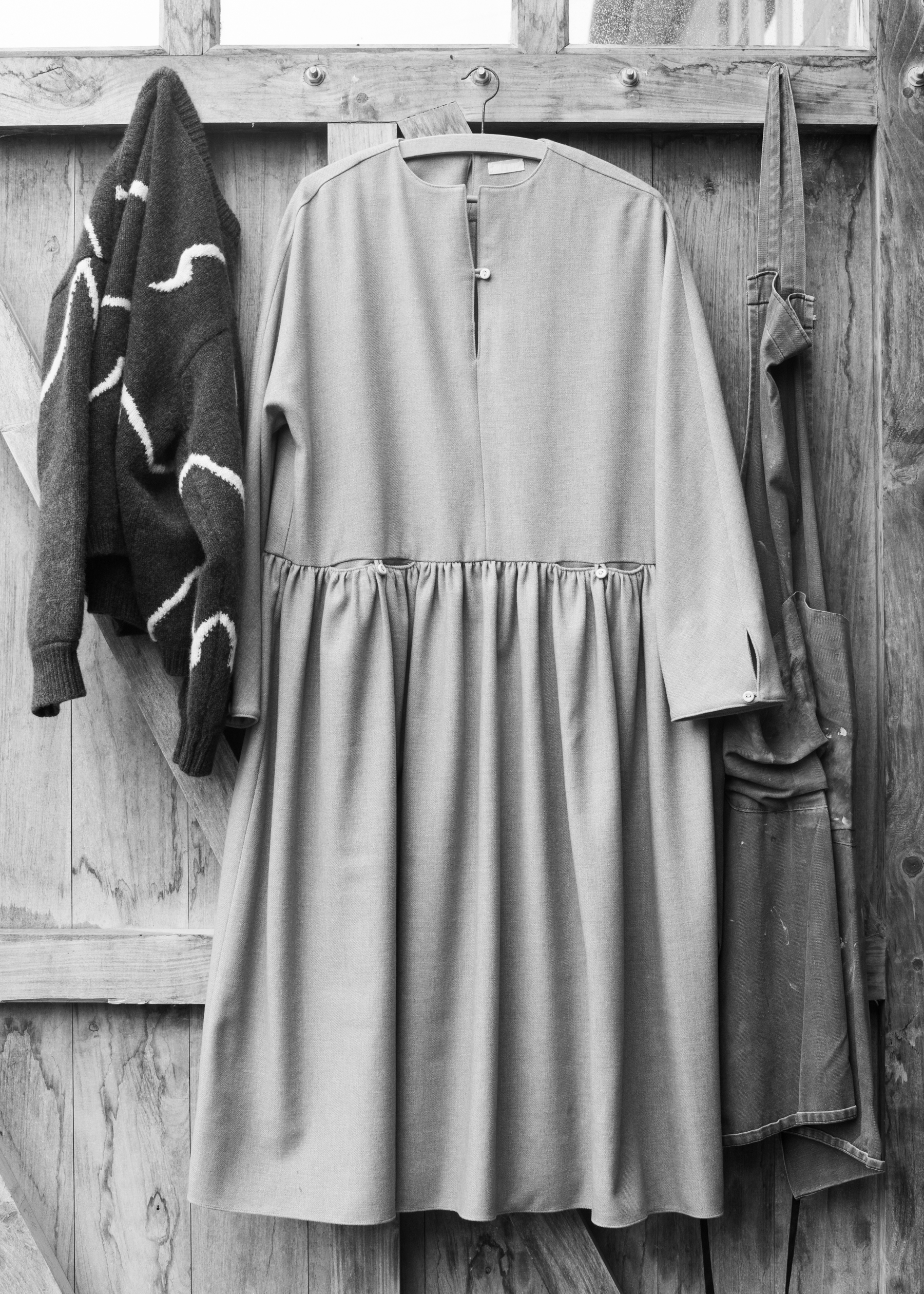 Soft and fluid gathered skirt dress with split neck facing and 2 front pockets on waist with button and loop fastening. This dress has a laid back feel with split sleeves that can be folded up.