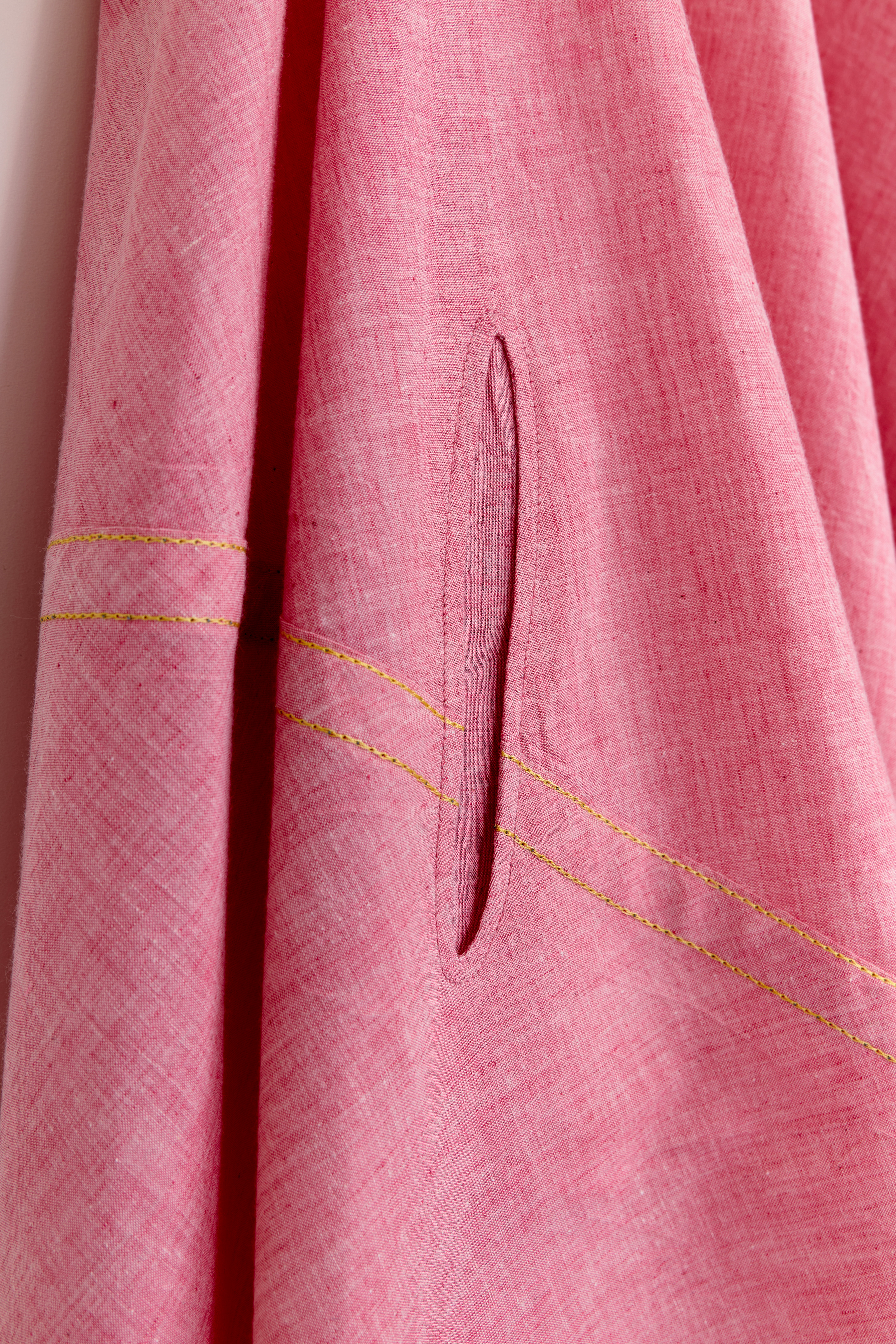 Voluminous circle cut dress with cut-out pockets on front dress and single button and loop on back neck.Fabric & Care