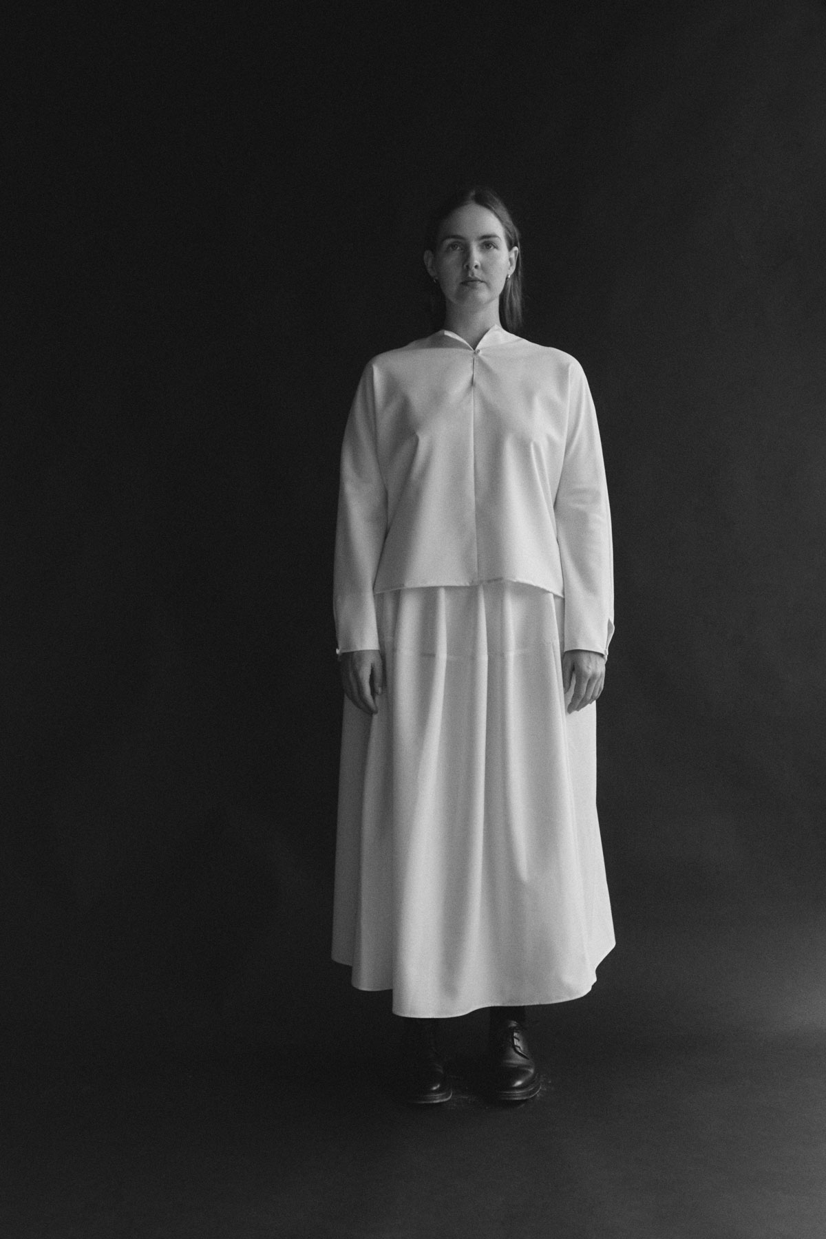Soft and fluid top with split neck facing featuring button and loop fastening on front and back neck. Split hem sleeves that can be folded up also include button and loop detail.Fabric & Care